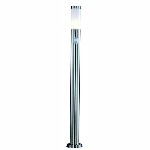 Kültéri mozgás-érzékelős álló lámpa rozsdamentes acél vázzal és műanyag betétes búrával, IP44-es védelemmel.
