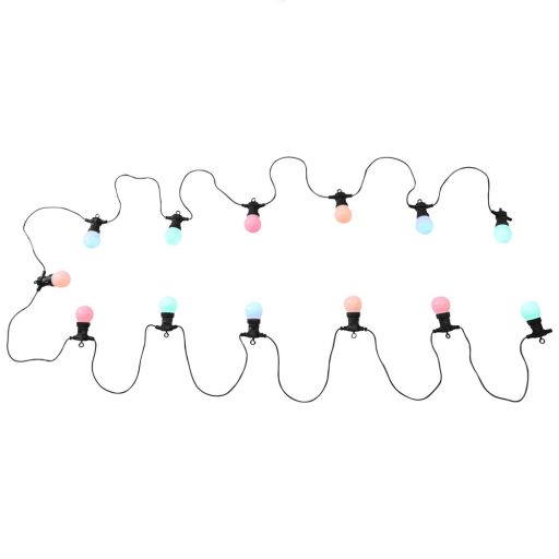 Kültéri 9,5 m hosszú party fény füzér 20db színes beépített LED fényforrással, 3 m hosszú vezetékkel, IP44-es védelemmel.