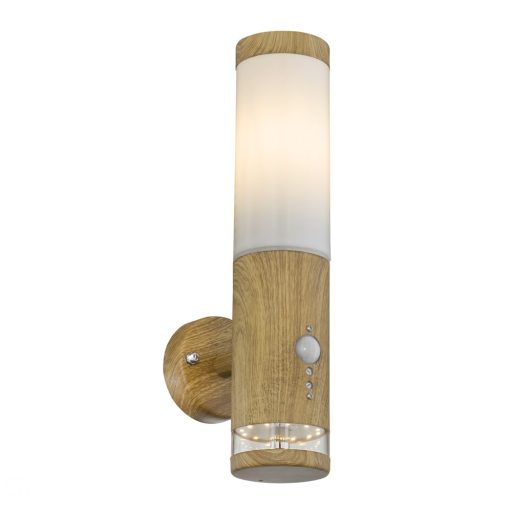 Fa hatású festéssel ellátott rozsdamentes acél kültéri mozgás-érzékelős fali lámpa opálos műanyag búrával, 1db E27-es foglalattal, alul dekor LED világítással, IP44-es védelemmel.