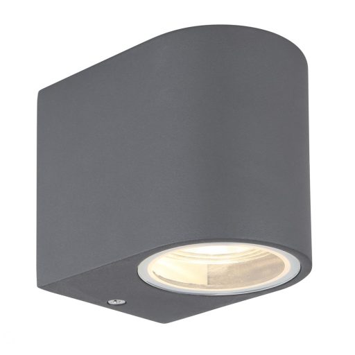 Antracit színű alumínium öntvény kültéri fali lámpa üveg betéttel, GU10-es foglalattal, IP44-es védelemmel.