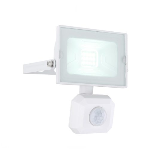 Fehér színű alumínium öntvény mozgás-érzékelős LED reflektor üveg betéttel, 10W, 6000K kékes hideg fehér fényű beépített LED fényforrással, IP44-es védelemmel.