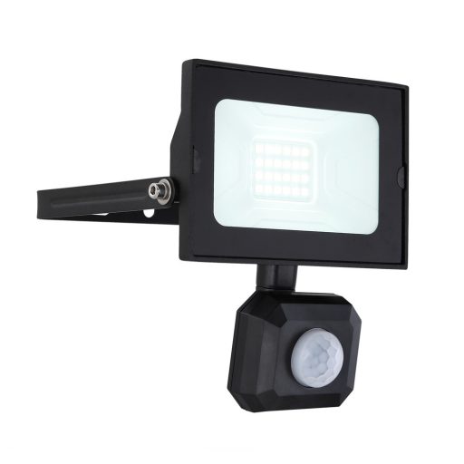 Fekete színű alumínium öntvény mozgás-érzékelős LED reflektor üveg betéttel, 20W, 6000K kékes hideg fehér fényű beépített LED fényforrással, IP44-es védelemmel.