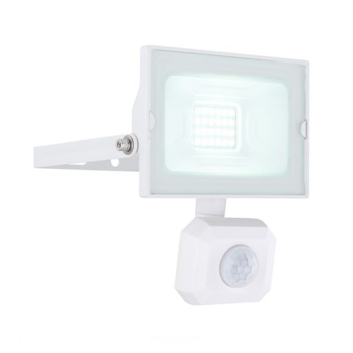 Fehér színű alumínium öntvény mozgás-érzékelős LED reflektor üveg betéttel, 20W, 6000K kékes hideg fehér fényű beépített LED fényforrással, IP44-es védelemmel.