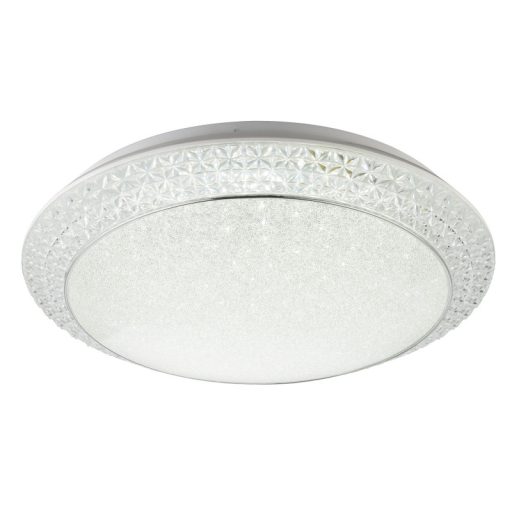 Csillógó, kerek mennyezeti lámpa fehér színű fém vázzal, króm gyűrű dekorral, akril kristály díszítéses műanyag búrával, beépített LED fényforrással. A lámpához távirányító tartozik, mely segítségével állítható a lámpa fényereje és színhőmérséklete (3000-6000K között), lletve a lámpa éjszakai fény funkcióval is rendelkezik.