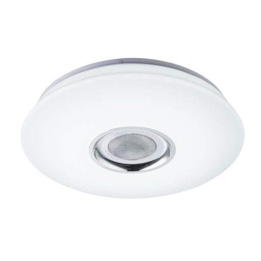 Minden igényt kielégítő, multifunkciós mennyezeti lámpa fehér színű fém vázzal, króm betétes, csillagos égbolt effektes műanyag búrával, beépített LED fényforrással. A lámpához távirányító tartozik, mely segítségével állítható a lámpa fényereje és színhőmérséklete (3000-6000K között), színe illetve a lámpa éjszakai fény funkcióval is rendelkezik. A lámpa továbbá saját beépített hangszóróval rendelkezik, melyet bluetoothon keresztül irányathatunk.