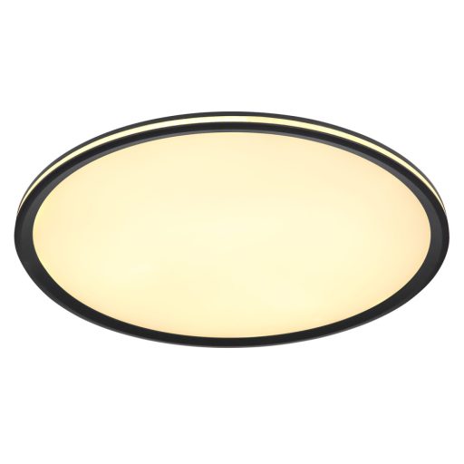 Matt fekete színű fém vázas mennyezeti lámpa opálos műanyag búrával, beépített meleg fehér színhőmérsékletű LED fényforrással. A lámpa világítása fali kapcsoló segítségével 3 lépésben állítható. 1: a középső rész világít, 2: csak a perem világít, 3: minden együtt világít.