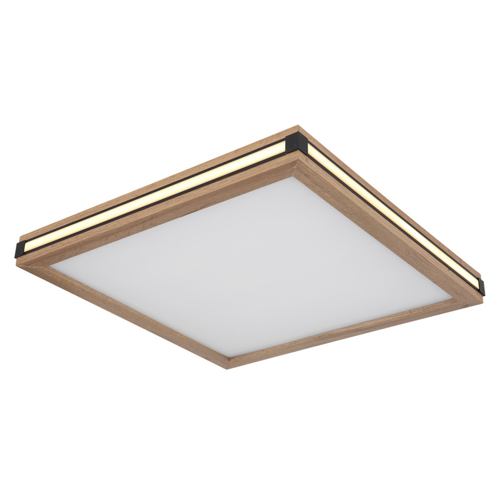 Matt fehér színű fém vázas mennyezeti lámpa fekete fém és fa hatású MDF dekoros, műanyag búrával, beépített meleg fehér színhőmérsékletű LED fényforrással. A lámpa világítása fali kapcsoló segítségével 3 lépésben állítható. 1: csak az alsó LED világít, 2: csak a lámpa szélén lévő LED világít, 3: minden együtt világít.