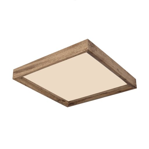Matt fehér színű fém vázas mennyezeti lámpa fa hatású MDF kerettel és opálos műanyag búrával, 24W beépített LED fényforrással. A lámpa színhőmérséklete(2700-4500-6500K között) fali kapcsoló segítségével állítható.