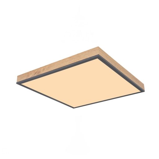 Fekete színű fém vázas mennyezeti lámpa fa hatású MDF kerettel, opálos műanyag búrával, 24W meleg fehér színhőmérsékletű beépített LED fényforrással.
