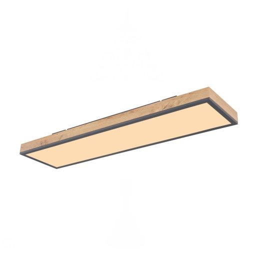 Grafit színű fém vázas mennyezeti lámpa fa hatású MDF kerettel, opálos műanyag búrával, 24W meleg fehér színhőmérsékletű beépített LED fényforrással.