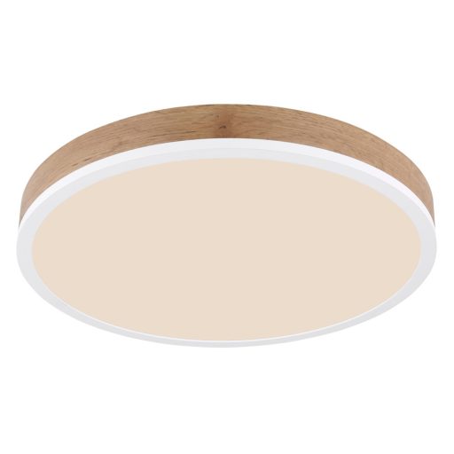 Matt fehér színű fém vázas mennyezeti lámpa fa hatású MDF dekorral, opálos műanyag búrával, beépített meleg fehér színhőmérsékletű LED fényorrással.