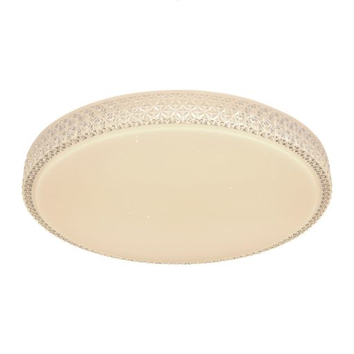 Modern stílusú mennyezeti lámpa fehér színű fém vázzal, műanyag kristály keretes, opálos, csillagos égbolt effektes akril búrával, 40W beépített LED fényforrással. A lámpához távirányító tartozék, mely segítségével állítható a LED fényereje, illetve a színhőmérsékelte 3000-4500-6500K között. A lámpa továbbá éjszakai fény, időzítő és memória funkcióval is rendelkezik.