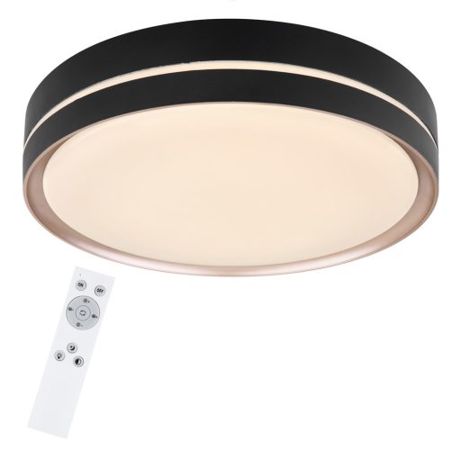 Modern stílusú, falra és mennyezetre egyaránt szerelhető lámpa fehér színű fém vázzal, fekete keretes, bronz dekoros, opálos műanyag búrával, 24W beépített LED fényforrással. A lámpához távirányító tartozék, mely segítségével állítható a LED fényereje, illetve a színhőmérsékelte 2700-4200-6500K között. A lámpa továbbá éjszakai fény és memória funkcióval is rendelkezik.