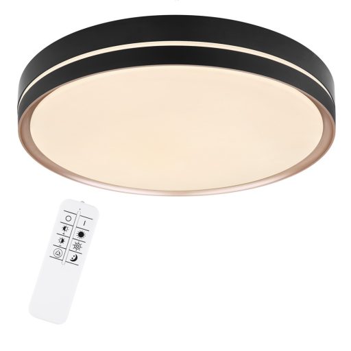 Modern stílusú, falra és mennyezetre egyaránt szerelhető lámpa fehér színű fém vázzal, fekete keretes, bronz dekoros, opálos műanyag búrával, 40W beépített LED fényforrással. A lámpához távirányító tartozék, mely segítségével állítható a LED fényereje, illetve a színhőmérsékelte 2700-4200-6500K között. A lámpa továbbá éjszakai fény és memória funkcióval is rendelkezik.