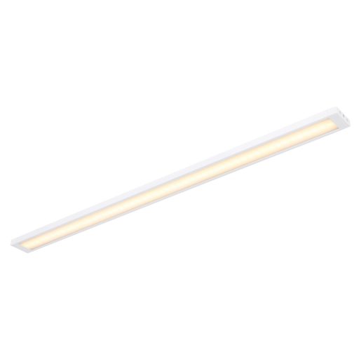 Fehér színű műanyag pultvilágító lámpa beépített, meleg fehér színhőmérsékletű LED fényforrással, billenőkapcsolóval a kábelen, adapterrel, 3M fóliával a ragasztáshoz, vagy csavarokkal a rögzítéshez.