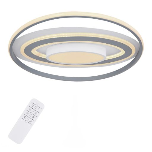 Design mennyezeti lámpa matt fehér színű fém vázzal, szürke fém és fehér színű akril betétes búrával, 60W beépített LED fényforrással. A lámpához távirányító tartozék, mely segítségével állítható a LED fényereje , illetve a színhőmérsékelte 3000-4500-6000K között. A lámpa továbbá éjszakai fény és memória funkcióval is rendelkezik.