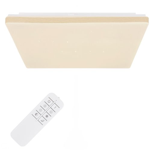 Okos mennyezeti lámpa fehér színű fém vázzal, opálos, csillagos égbolt effektes műanyag búrával, világos fa hatású dekor széllel, 24W beépített LED fényforrással. A lámpához távirányító tartozék, mely segítségével állítható a lámpa fényereje, színhőmérséklete(2700-6000K között) illetve éjszakai fény és memória és időzítő funkcióval is rendelkezik. Ugyanezen funkció telefonra letöltött applikáció segítségével is elérhetőek.