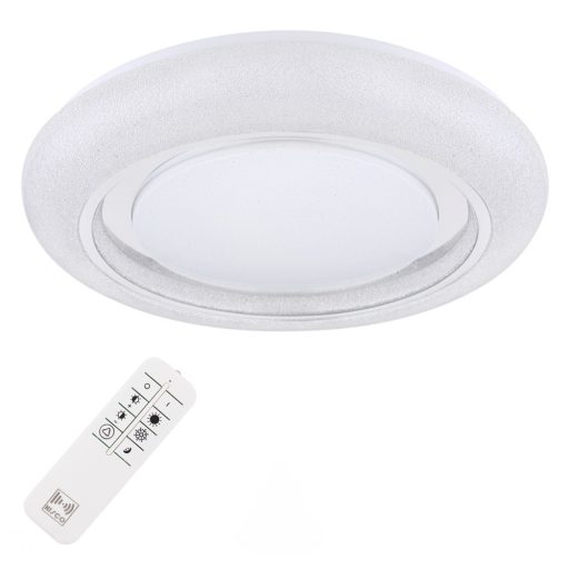 Okos mennyezeti lámpa fehér színű fém vázzal, opálos akril búrával, króm dekorral, 28W beépített LED fényforrással. A búra külső része cukor dekoros, a középső rész csillagos égbolt effektes. A lámpához távirányító tartozék, mely segítségével állítható a lámpa fényereje, színhőmérséklete(3000-6000K között), illetve éjszakai fény és memória funkcióval is rendelkezik. Ugyanezen funkció telefonra letöltött applikáció segítségével is elérhetőek.