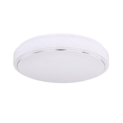 Csillagos égbolt effektes mennyezeti lámpa fehér színű fém vázzal, króm betétes műanyag búrával, beépített LED fényforrással. A lámpa színhőmérséklete (3000-6000K között) fali kapcsoló segítségével szabályozható.