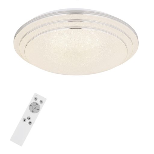 Fehér színű fém vázas mennyezeti lámpa opálos, cukor dekoros akril búrával, króm díszítő gyűrűvel, 18W beépített LED fényforrással.A lámpához távirányító tartozék, mely segítségével állítható a lámpa fényereje, színhőmérséklete(2700-6500K között) illetve éjszakai fény és memória funkcióval is rendelkezik.