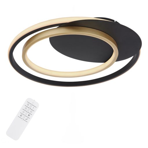 Design mennyezeti lámpa matt fekete és arany színű fém és alumínium vázzal, opálos műanyag betétes búrával, 36W beépített LED fényforrással. A lámpához távirányító tartozék, mely segítségével állítható a LED fényereje, illetve a színhőmérsékelte 3000-4000-6000K között. A lámpa továbbá éjszakai fény és memória funkcióval is rendelkezik.