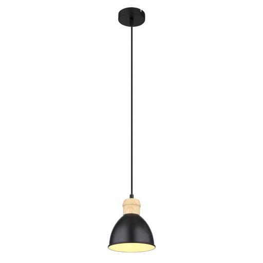 Fekete színű fém vázas függeszték fa kinézetű fém dekorral, kívül fekete, belül fehér színű fém búrával. A lámpa E27-es foglalattal rendelkezik, fényforrást nem tartalmaz.