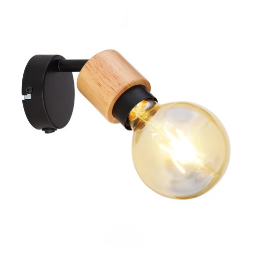 Matt fekete színű fém vázas, világos fa dekoros spot lámpa, mozgatható E27-es foglalattal, lámpatesten lévő kapcsolóval. Dekor, vagy filament LED fényforrással mutat a legjobban, ami nem tartozék.