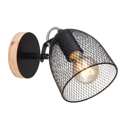 Matt fekete színű fém vázas, fa betétes spot lámpa, fekete színű fém búrával, mozgatható fejjel, E27-es foglalattal. Dekor, vagy filament LED fényforrással mutat a legjobban, ami nem tartozék.
