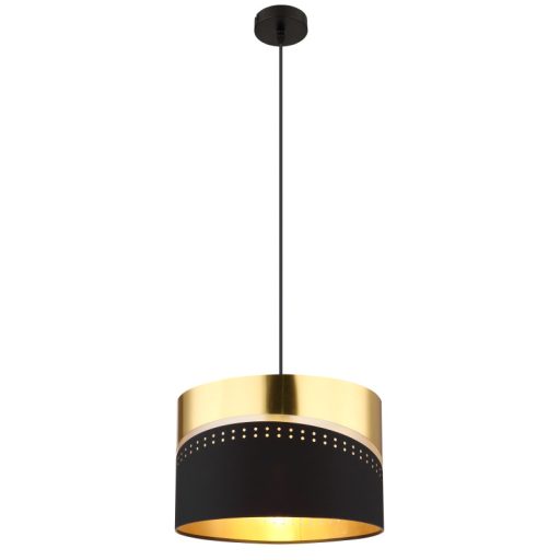 Függeszték fém fekete matt, textil fekete, műanyag arany színek, kábel PVC fekete, ø: 350mm, M: 1200mm, 1x E27 60W 230V izzó nélkül
