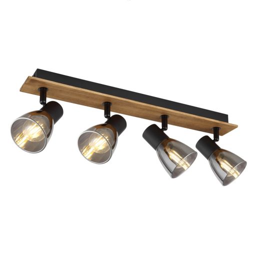 Matt fekete színű fém vázas, fa betétes spot lámpa füstszínű üveg búrával, billenthető fejjel, E14-es foglalattal.