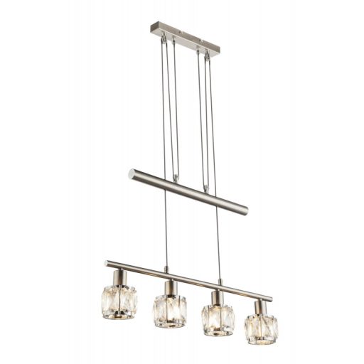 Csillogó megjelenésű függeszték lámpa matt nikkel és króm színű fém vázzal, üveg kristály búrával. A lámpa belógása 100-160 cm között állítható.