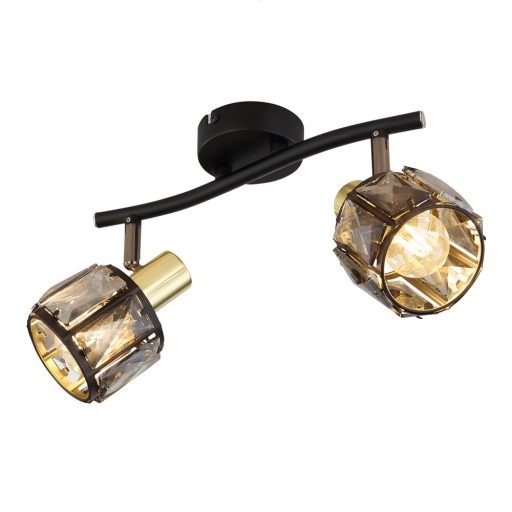 Matt fekete színű fém vázas spot lámpa arany színű betéttel, füstszínű üveg kristály betétes búrával, E14-es foglalattal, billenthető fejjel.
