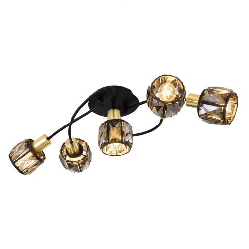 Matt fekete színű fém vázas mennyezeti lámpa arany színű betéttel, füstszínű üveg kristály betétes búrával, E14-es foglalattal.