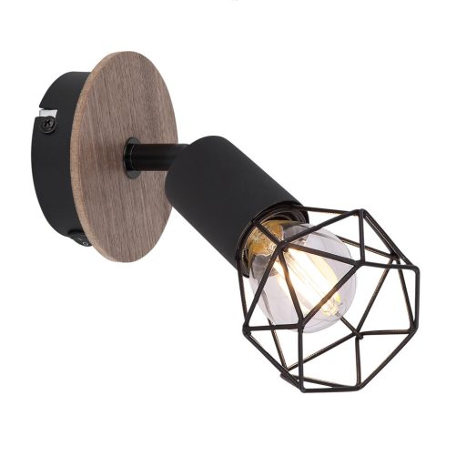 Matt fekete színű fém vázas, sötét fa dekoros spot lámpa, fekete, fém búrával, mozgatható fejjel, E14-es foglalattal, lámpatesten lévő kapcsolóval. Dekor, vagy filament LED fényforrással mutat a legjobban, ami nem tartozék.
