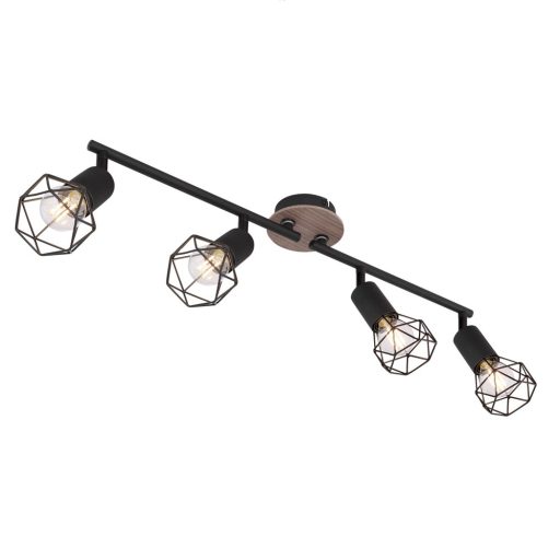 Matt fekete színű fém vázas, sötét fa dekoros spot lámpa, fekete, fém búrával, mozgatható fejjel, E14-es foglalattal. Dekor, vagy filament LED fényforrással mutat a legjobban, ami nem tartozék.