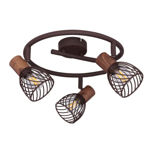 Rozsdabarna színű fém vázas spot lámpa fahatású dekorral, rozsdabarna színű drótháló búrával. A lámpa dekor fényforrással mutat a legjobban, ami nem tartozék.