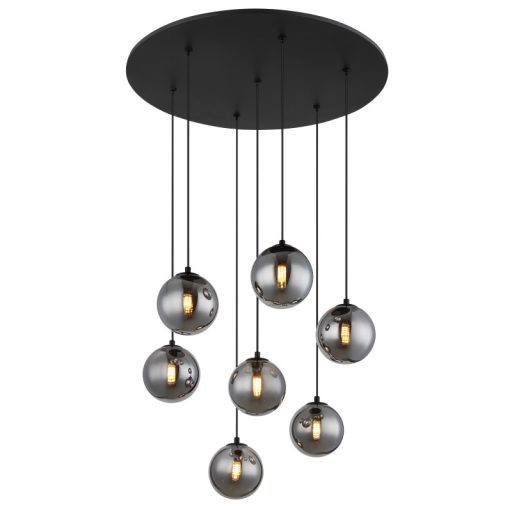 Függeszték fém fekete matt, füstszínű üveg gömbök, fekete PVC kábel, magassága rövidíthető, ø: 550mm, M: 1200mm, tartozék: 7x G9 LED 3.5W 230V, 350lm forrás, 130lm kimenet, 3000K
