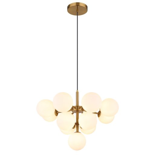Függeszték fém aranyszínű matt, fehér színű üveg gömbök, fekete textil kábel, ø: 560mm, M: 1200mm, 13x G9 LED 5W 230V izzók nélkül