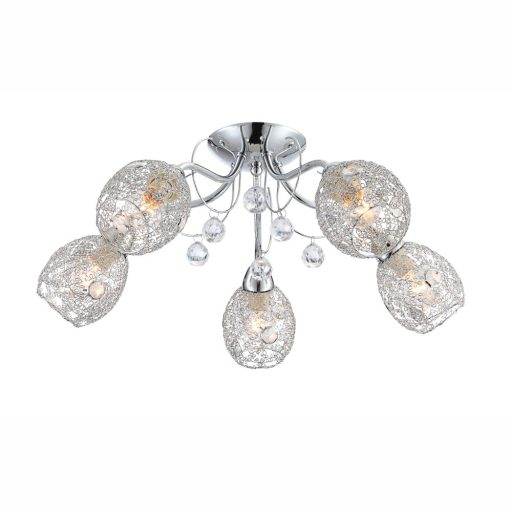 Króm színű fém vázas mennyezeti lámpa, fém háló búrával, üveg kristály dekorral.