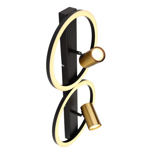 Matt fekete színű fém vázas mennyezeti lámpa opálos műanyag betétes búrával, beépített meleg fehér színhőmérsékletű LED fényforrással és 2db matt sárgaréz színű állítható GU10-es foglalatú fejjel.