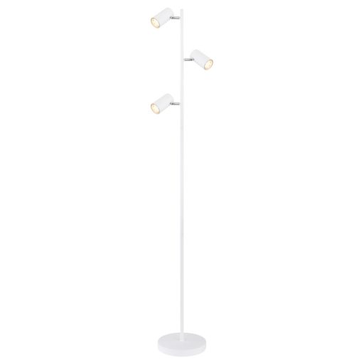 Matt fehér színű, króm dekoros fém álló lámpa billenthető fejekkel, GU10-es foglalattal, vezetékre szerelt kapcsolóval.