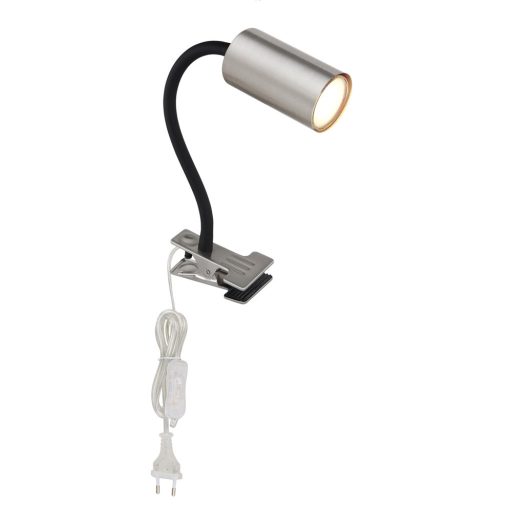Matt nikkel színű fém csiptetős lámpa fekete, flexibilis műanyag karral, 1db GU10-es foglalattal. A lámpát vezetékre szerelt kapcsolóval szállítjuk.