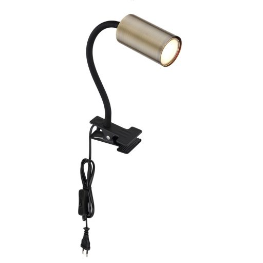 Fekete színű fém csiptetős lámpa fekete, flexibilis műanyag karral, antik sárgaréz színű fejjel, 1db GU10-es foglalattal. A lámpát vezetékre szerelt kapcsolóval szállítjuk.