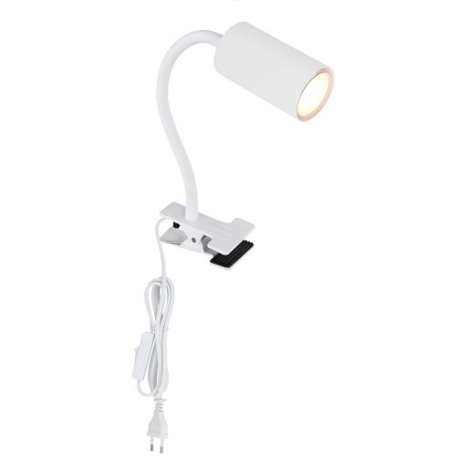 Fehér színű fém csiptetős lámpa fehér, flexibilis műanyag karral, 1db GU10-es foglalattal. A lámpát vezetékre szerelt kapcsolóval szállítjuk.