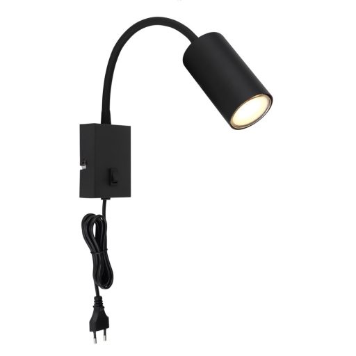 Fekete színű fém falikar fekete, flexibilis műanyag karral, 1db GU10-es foglalattal, lámpatesten lévő kapcsolóval. A lámpa vezetékkel és dugvillával szerelt, így aljzatba csatlakoztatható.