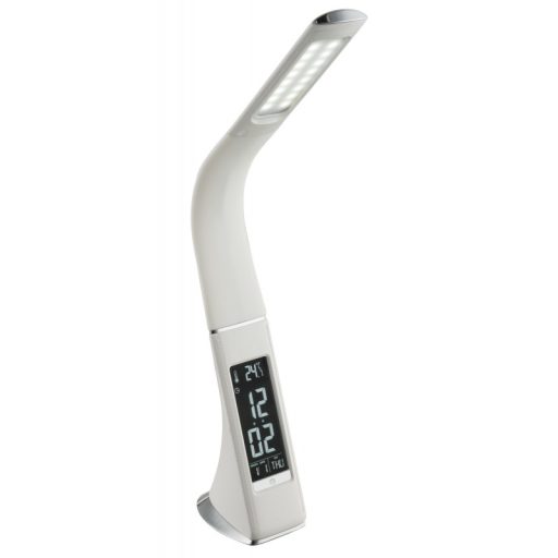 Fehér színű, bőr hatású műanyag íróasztali lámpa króm dekorral és flexibilis silicon karral ,üveg betéttel, beépített LED fényforrással. A lámpa érintőkapcsolóval rendelkezik,melynek segítségével állítható a fényereje és színhőmérséklete (3000-5800K között). A lámpa továbbá mutatja az időt, dátumot illetve a hőmérsékletet.