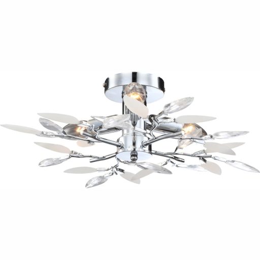 Króm színű fém vázas mennyezeti lámpa, fehér és átlátszó levél alakú akril kristály dekorral. Gyertyaláng alakú izzót ajánlunk hozzá a tökéletes összhatás végett.