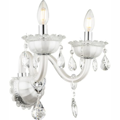 Klasszikus formavilágú, anyagában újraértelmezett falikar, króm színű fém vázzal, fehér színű üveg és áttetsző, K5 kristály dekorral.