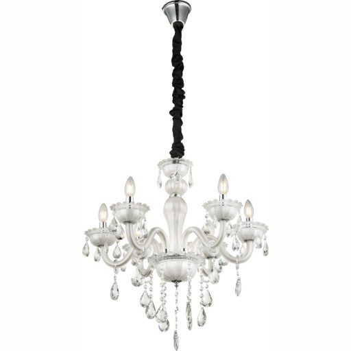 Klasszikus formavilágú, anyagában újraértelmezett csillár, króm színű fém vázzal, fehér színű üveg és áttetsző, K5 kristály dekorral, fekete színű textil lánc takaróval.
