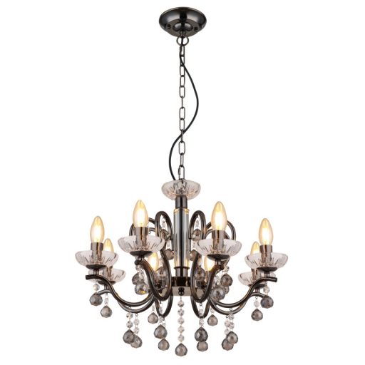 Csillár fém fekete-króm, füstszínű/átlátszó üvegkristályok, magassága lerövidíthető, ø: 520mm, M: 1250mm, 8x E14 40W 230V izzók nélkül